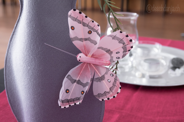 Für das aktuelle Frühlingsthema schwebte mir eine pinke Dekoration vor mit pinken Orchideen, rosa Schmetterlingen und pinken Tischläufern vor, alles Dinge, die wir bereits an Lager hatten und die ich nun mit den Filzvasen mal ganz anders und neuartig in Szene setzen wollte.