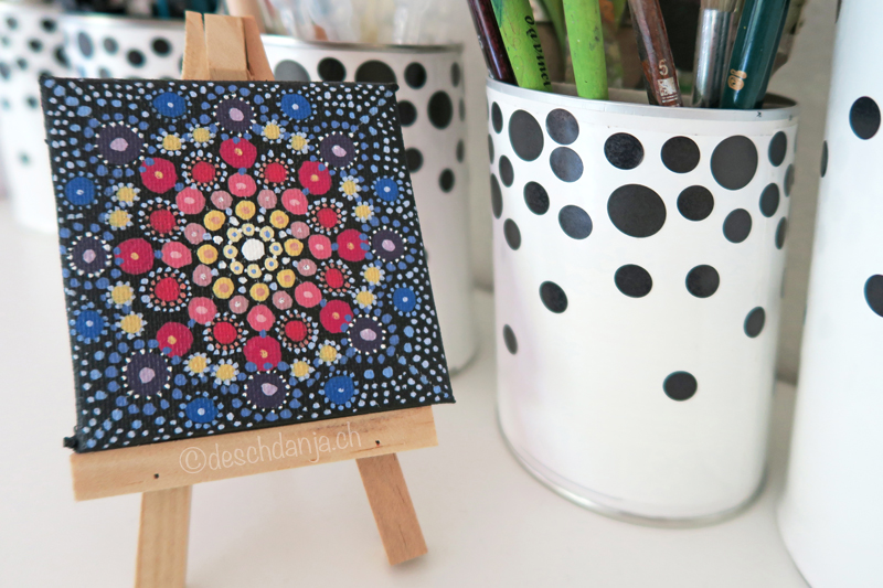 Dot Painting Mandala auf einem süssen kleinen Mini Keilrahmen. Sehr dekorativ, schnell gemacht und einfach putzig.