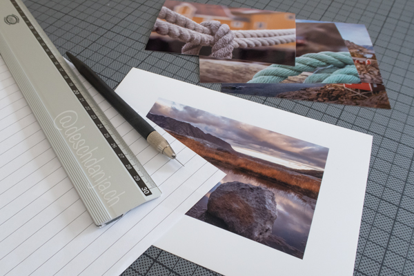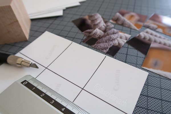 Zuerst musst du 6 Fotos im richtigen Format ausdrucken. Ich nehme meine Fotos im Format 2 zu 3 auf, daher kommt auch die Anzahl der Würfel: Zwei Reihen zu 3 Würfeln. Da die Seitenkante eines Würfels 4cm beträgt, komme ich auf ein Format von 8x12cm für meine Fotos. Passendes Fotopapier gibt es dafür natürlich nicht, was bedeutet, dass ich den weissen Rand einfach noch manuell wegschneiden musste. Am besten geht das mittels Schneidematte, Schneidelineal und Cutter. Um das Foto auch nicht zu zerkratzen oder zu verletzen, habe ich noch ein Stück Papier unter das Lineal gelegt.