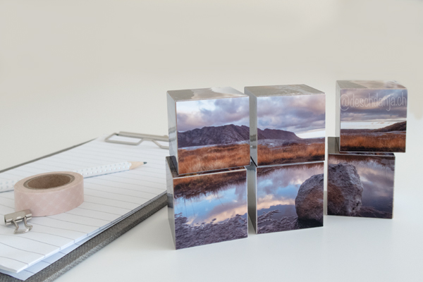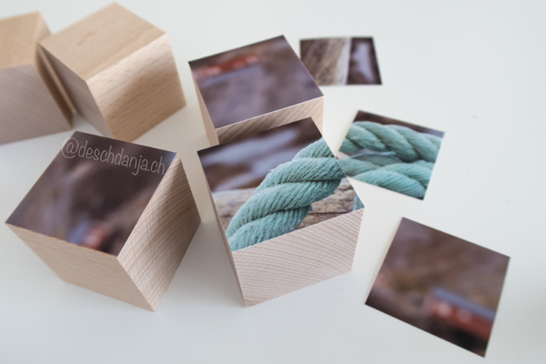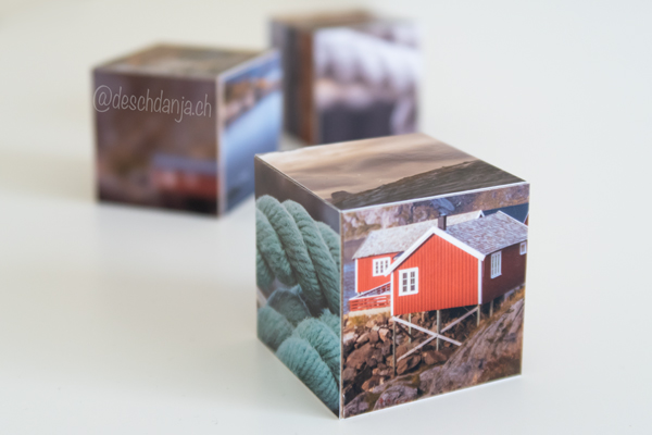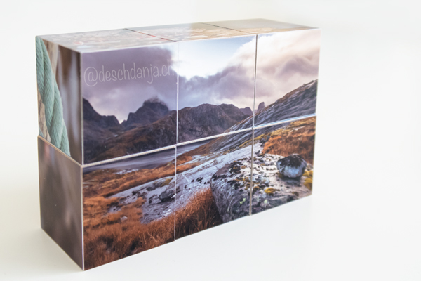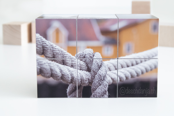Mit diesem Puzzlespiel habe ich also nicht nur ein Foto, sondern gleich sechs Fotos kreativ in Szene gesetzt. Je nach Lust und Laune, kann ein anderes Foto in den Vordergrund gestellt und der Würfel beliebig oft umgebaut werden. Vielleicht wollt ihr auch lieber kleinere oder grössere Würfel benutzen oder mehr als nur 6 Einzelteile, da seid ihr natürlich sehr frei.
