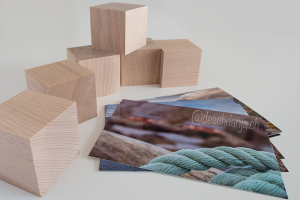 Die Idee mit den Bilderwürfeln kam dann ganz spontan und wollte auch sogleich umgesetzt werden. Zum Glück hatte der Bastelshop an der Ecke genau das was ich gesucht habe, nämlich 6 wunderschön und präzise gearbeitete Holzwürfel.