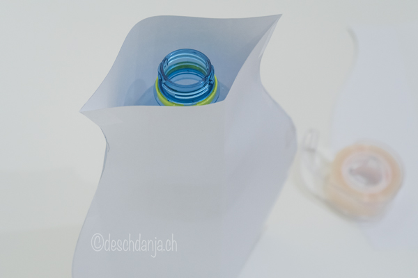 Schnapp dir eine leere Flasche und ein Stück Papier. Das Papier faltest du einmal längs. Markiere die Höhe der fertigen Husse, diese sollte etwas länger werden als die Flasche selber lang ist, damit man die Flasche darin nicht gleich auf einen Kilometer Entfernung sehen kann.