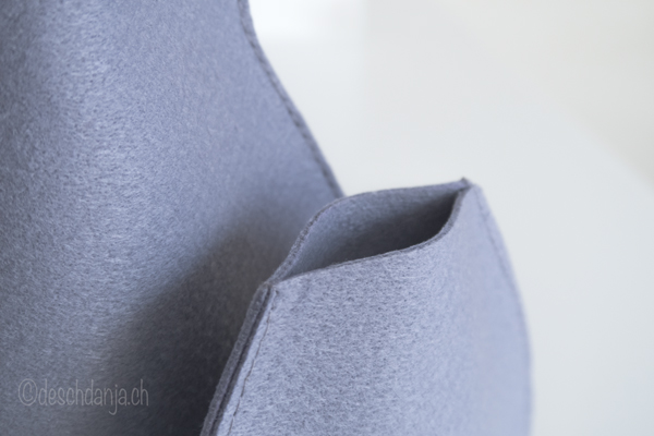 Bist du mit der Form zufrieden legst du sie auf dein Filzstück, markierst die Ränder und schneidest das Modell mit der Schere aus. Natürlich brauchst du noch ein zweites, identisches Filzstück. Dann gehts an die Nähmaschine. Mit einem schlichten Geradstich nähst du die Seitenkanten zusammen und schon ist deine schicke Vasenhusse fertig. Was ich an Filz so schätze ist einerseits seine Robustheit und andererseits die Tatsache, dass man ihn nicht vernähen muss. Das macht ihn wirklich zu einem tollen Material