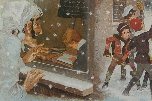 Er nahm Ebenezer bei der Hand und zusammen schritten sie durch die Wand. Schon standen sie mitten auf einer Dorfstrasse. „Du lieber Himmel!“ rief Scrooge. „Hier wohnte ich als ich klein war.“ Eine Menge fröhlicher Kinder spielte im Schnee und riefen: „Fröhliche Weihnachten!“