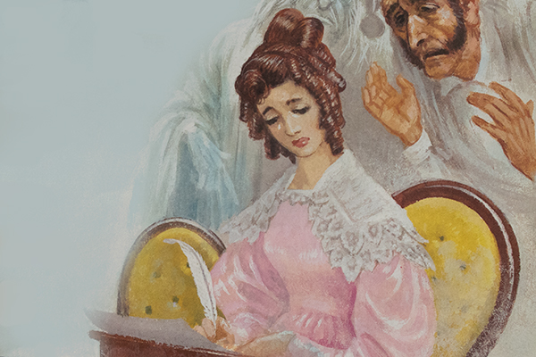 „Das Mädchen konnte sie nicht sehen Tränen strömten über ihr Gesicht. Sie schrieb gerade einen Brief. Scrooge schaute ihr über die Schulter. „Lieber Ebenezer, ich werde dich verlassen, da ich erkannt habe, dass du das Geld mehr liebst als mich. Adieu. Deine geliebte Clara.“