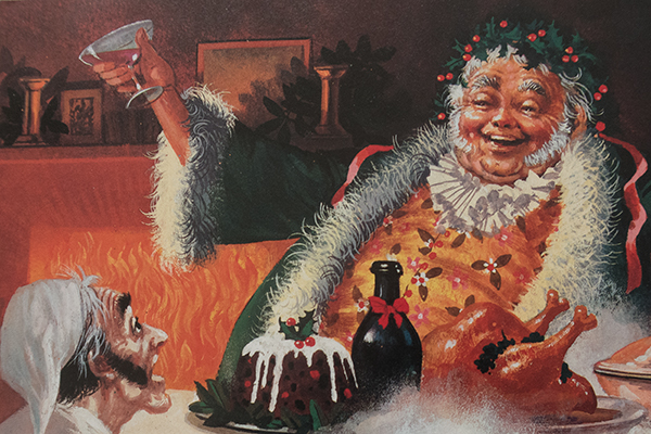 Scrooge war so erschöpft, dass er nur mit Mühe die Kerze ausblasen konnte, ehe er in die Kissen sank. Plötzlich wachte er auf, denn die Uhr hatte wieder eins geschlagen. Unter der Tür war Licht zu sehen und eine Stimme rief: „Komm!“ Im Zimmer nebenan tanzte ein fröhliches Gespenst in einem grünen Mantel. Es hatte einen grünen, stacheligen Kranz auf dem Kopf. „Ich bin der Geist der diesjährigen Weihnacht.“
