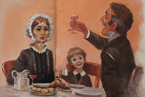 Aber niemand in dem armseligen Häuschen beklagte sich über das karge Mahl. Bob setze zu einem Trinkspruch an: „Auf Ebenezer Scrooge, der meinen Lohn zahlt und dieses Mahl ermöglichte.“ „Gott segne ihn!“ rief Tim. Aber die Frau stellte ihr Glas wieder zurück. „Nein, ich trinke nicht auf diesen kaltherzigen Geizhals.“ Scrooge liess die Arme hängen. „Bring mich nach Hause“, bat er den Geist. Aber das Gespenst war verschwunden.