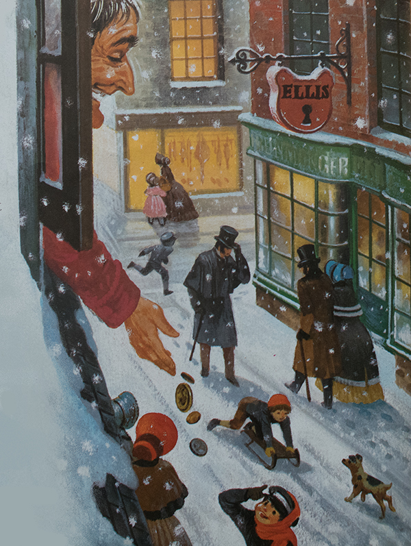 Er nahm Ebenezer bei der Hand und zusammen schritten sie durch die Wand. Schon standen sie mitten auf einer Dorfstrasse. „Du lieber Himmel!“ rief Scrooge. „Hier wohnte ich als ich klein war.“ Eine Menge fröhlicher Kinder spielte im Schnee und riefen: „Fröhliche Weihnachten!“