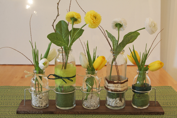 Abgesehen davon eignen sich Blumen, Blüten und Blätter natürlich immer. Neben der organischen Variante gibt es mittlerweile an vielen Orten auch schöne künstliche Exemplare zu kaufen, denen man nicht schon aus einem Kilometer Entfernung ihre Künstlichkeit ansieht. Ikea und Depot haben viele hübsche Blumen- und Pflanzenartikel im Sortiment. Die kann man immer wieder anders arrangieren und einsetzen.