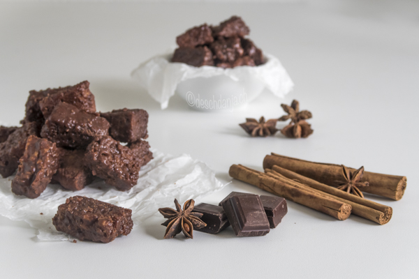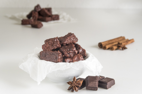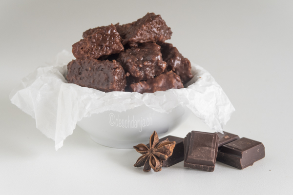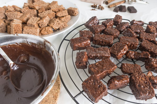 Doch nun wird es magisch, denn die trockenen Magenbrotstückchen werden mit einer Puderzucker-Schokoglasur überzogen – Yeah!