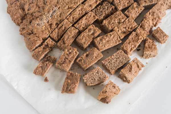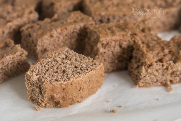 Den Teig auf ein mit Backpapier belegtes Blech ausstreichen und in der Ofenmitte bei 180°C für 15-20 Minuten backen. Den Teig anschliessend auskühlen lassen und in 2x4cm kleine Rechtecke schneiden.