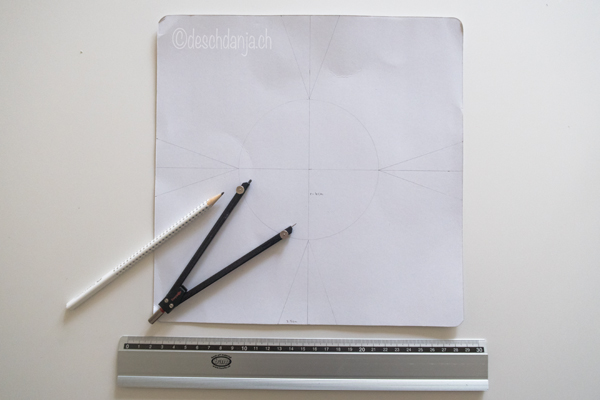 Mit Bleistift und Lineal halbiert ihr nun beide Seiten und erhaltet so den Mittelpunkt eures Quadrates. Mit einem Zirkel zeichnet ihr von der Mitte ausgehend einen Kreis. Der Durchmesser sollte etwas grösser sein als der Boden eurer Schüssel. Ich habe einen Radius von 6cm eingezeichnet.