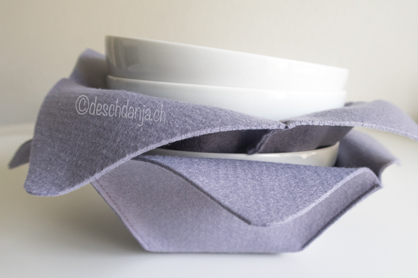 Legt eure Schüssel auf den Filz und drapierta die Seiten des Filzes um die Schüssel herum um Mass zu nehmen. Ich kam auf ein Quadrat von 26x26cm (mit abgerundeten Ecken).