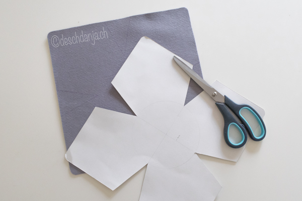 Legt die Vorlage auf den Filz und zeichnet die Form mit einem Sublimatstift nach. Anschliessend schneidet ihr die Aussenkanten aus. Die dreieckigen Stücke werden nicht ausgeschnitten sondern lediglich eingezeichnet.