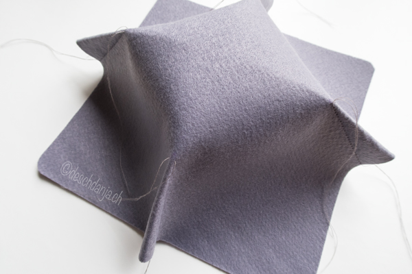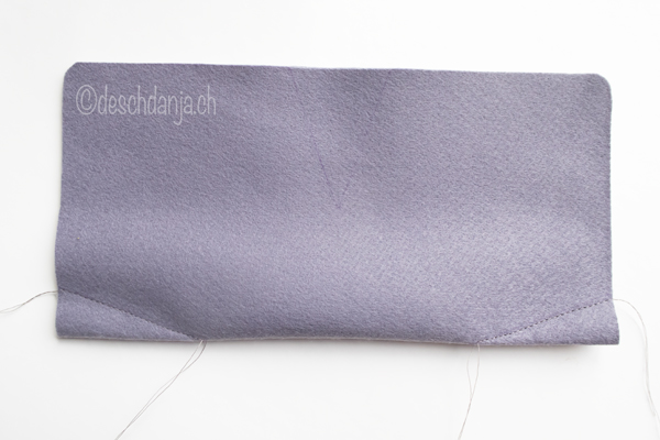 Dann öffnet ihr euer Filzstück, legt es in der anderen Richtung zusammen und näht die anderen beiden Ecken zusammen. Bei dem dicken Filz hat es mit dem Rückstich zum vernähen nicht hingehauen, weshalb ich hier die Fäden ganz altmodisch verknotet und abgeschnitten habe.