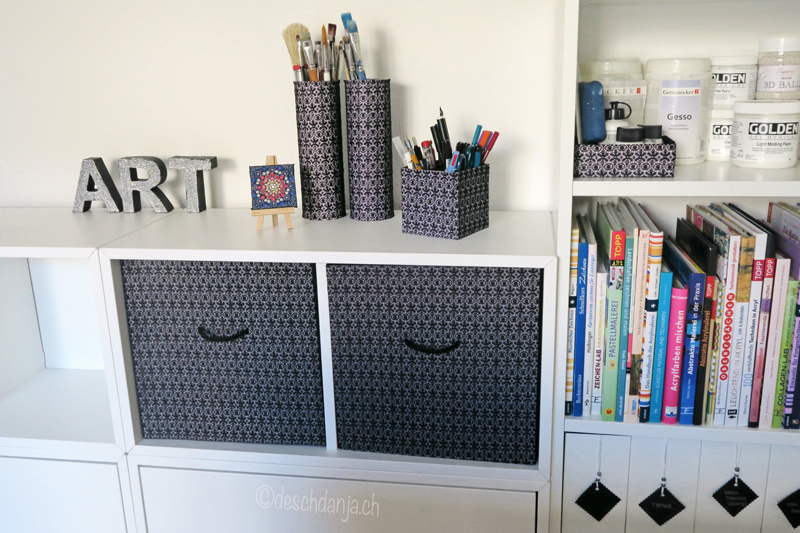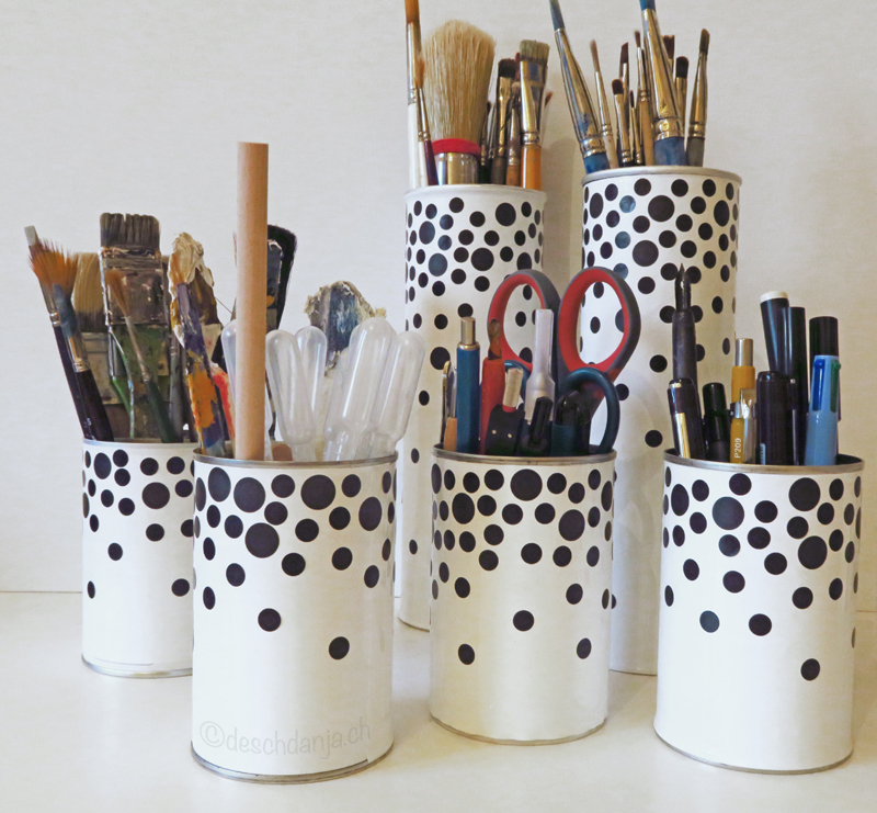 Mit selbstklebender Folie und runden Klebe-Etiketten kann man Dosen sehr schön verzieren und sie in stylische Organisationshilfen verwandeln.