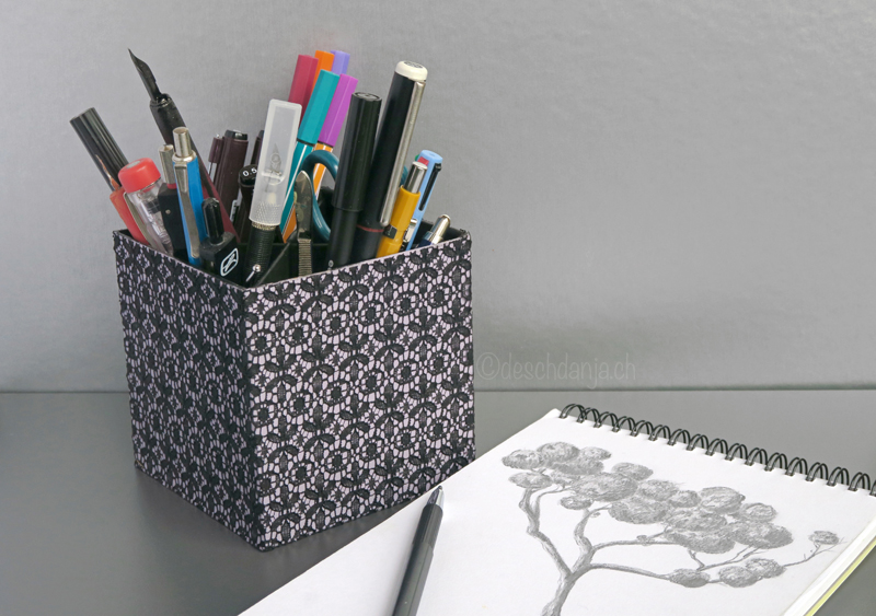 Heute zeige ich euch, wie ihr eine individuelle Stiftebox mit Unterteilungen und hübscher Spitzenverzierung basteln könnt.
