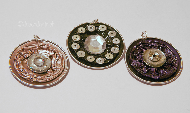 Nespresso Kapseln eignen sich super um Schmuckanhänger zu basteln. Sie werden zuerst platt geklopft und anschliessend mit verschiedenen Kleinigkeiten verziert und aufgepeppt.
